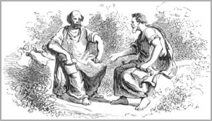 Le premier maître qu’il eut l’envoya aux champs labourer la terre, soit qu’il le jugeât incapable de toute autre chose, soit pour s’ôter de devant les yeux un objet si désagréable. Or il arriva que ce maître étant allé voir sa maison des champs, un paysan lui donna des figues: il les trouva belles, et les fit serrer fort soigneusement, donnant ordre à son sommelier, appelé Agathopus, de les lui apporter au sortir du bain. Le hasard voulut qu’Ésope eût affaire dans le logis. Aussitôt qu’il y fut entré, Agathopus se servit de l’occasion, et mangea les figues avec quelques-uns de ses camarades: puis ils rejetèrent cette friponnerie sur Ésope, ne croyant pas qu’il se pût jamais justifier, tant il étoit bègue et paroissoit idiot! Les châtiments dont les anciens usoient envers leurs XV esclaves étoient fort cruels, et cette faute très-punissable. Le pauvre Ésope se jeta aux pieds de son maître; et, se faisant entendre du mieux qu’il put, il témoigna qu’il demandoit pour toute grâce qu’on sursît de quelques moments sa punition. Cette grâce lui ayant été accordée, il alla quérir de l’eau tiède, la but en présence de son seigneur, se mit les doigts dans la bouche, et ce qui s’ensuit, sans rendre autre chose que cette eau seule. Après s’être ainsi justifié, il fit signe qu’on obligeât les autres d’en faire autant. Chacun demeura surpris: on n’auroit pas cru qu’une telle invention pût partir d’Ésope. Agathopus et ses camarades ne parurent point étonnés. Ils burent de l’eau comme le Phrygien avoit fait, et se mirent les doigts dans la bouche; mais ils se gardèrent bien de les enfoncer trop avant. L’eau ne laissa pas d’agir, et de mettre en évidence les figues toutes crues encore et toutes vermeilles. Par ce moyen, Ésope se garantit; ses accusateurs furent punis doublement, pour leur gourmandise et pour leur méchanceté. Le lendemain, après que leur maître fut parti, et le Phrygien étant à son travail ordinaire, quelques voyageurs égarés (aucuns disent que c’étoient des prêtres de Diane) le prièrent, au nom de Jupiter hospitalier, qu’il leur enseignât le chemin qui conduisoit à la ville. Ésope les obligea premièrement de se reposer à l’ombre; puis leur ayant présenté une légère collation, il voulut être leur guide, et ne les quitta qu’après qu’il les eut remis dans leur chemin. Les bonnes gens levèrent les mains au ciel, et prièrent Jupiter de ne pas laisser cette action charitable sans récompense. A peine Ésope les eut quittés, que le chaud et la lassitude le contraignirent de s’endormir. Pendant son sommeil, il s’imagina que la Fortune étoit debout devant lui, qui lui délioit la langue, et par le même moyen lui faisoit présent de cet art dont on peut dire qu’il est l’auteur. Réjoui de cette aventure, il se réveilla en XVI sursaut, et en s’éveillant: Qu’est ceci? dit-il, ma voix est devenue libre; je prononce bien un râteau, une charrue, tout ce que je veux. Cette merveille fut cause qu’il changea de maître. Car, comme un certain Zénas, qui étoit là en qualité d’économe et qui avoit l’œil sur les esclaves, en eut battu un outrageusement pour une faute qui ne le méritoit pas, Ésope ne put s’empêcher de le reprendre, et le menaça que ses mauvais traitements seroient sus. Zénas, pour le prévenir et pour se venger de lui, alla dire au maître qu’il étoit arrivé un prodige dans sa maison, que le Phrygien avoit recouvré la parole; mais que le méchant ne s’en servoit qu’à blasphémer et à médire de leur seigneur. Le maître le crut, et passa bien plus avant: car il lui donna Ésope, avec liberté d’en faire ce qu’il voudroit. Zénas de retour aux champs, un marchand l’alla trouver, et lui demanda si pour de l’argent il le vouloit accommoder de quelque bête de somme. Non pas cela, dit Zénas, je n’en ai pas le pouvoir: mais je te vendrai, si tu veux, un de nos esclaves. Là-dessus ayant fait venir Ésope, le marchand dit: Est-ce afin de te moquer que tu me proposes l’achat de ce personnage? on le prendroit pour une outre. Dès que le marchand eut ainsi parlé, il prit congé d’eux, partie murmurant, partie riant de ce bel objet. Ésope le rappela et lui dit: Achète-moi hardiment, je ne te serai pas inutile. Si tu as des enfants qui crient et qui soient méchants, ma mine les fera taire: on les menacera de moi comme de la bête. Cette raillerie plut au marchand. Il acheta notre Phrygien trois oboles, et dit en riant: Les dieux soient loués, je n’ai pas fait grande acquisition, à la vérité; aussi n’ai-je pas déboursé grand argent.