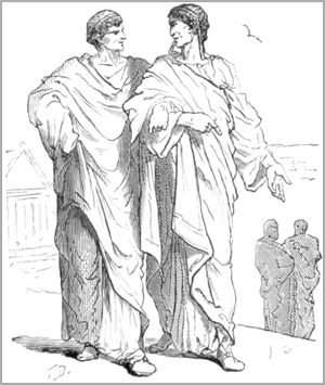 Ensuite de cela, le roi fit venir d’Héliopolis certains personnages d’esprit subtil, et savants en questions énigmatiques. Il leur fit un grand régal, où le Phrygien fut invité. Pendant le repas, ils proposèrent à Ésope diverses choses, celle-ci entre autres: Il y a un grand temple qui est appuyé sur une colonne entourée de douze villes; chacune desquelles a trente arcs-boutants, et autour de ces arcs-boutants, se promènent, l’une après l’autre, deux femmes, l’une blanche, l’autre noire. Il faut renvoyer dit Ésope, cette question aux petits enfants de notre pays. Le temple est le monde; la colonne l’an; les villes, ce sont les mois; et les arcs-boutants, les jours, autour desquels se promènent alternativement le jour et la nuit.