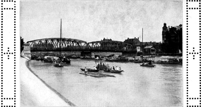 Langsam fährt unser Boot stromauf. Das Hangchouer Schiff mit seinem stattlichen Anhängsel ist schon ausser Sicht. Am englischen Stationär vorbei, passieren wir zwei weissgelbe russische Torpedoboote mit hochgebautem Vordersteven, ein graublaues deutsche Kriegsschiff, einen typischen Amerikaner und einen Holländer, der mit seinen zwei schwarzen Zylinderhüten auf gelben Schornsteinen so behäbig in der braunen Schokoladensauce des Huangpu liegt, wie der selige Droogstoppel zwischen seinen „Bruntjes“.