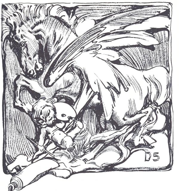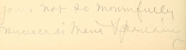 At the bottom of the poem At the Pleiades, by Maurice V. Samuels, there was in our copy of the book what appears to be a hand-written signature of Maurice Samuels. This is retained as an image in this transcription, although we don’t know whether it was present in only one or all printed copies of this book. The image was edited slightly, to remove traces of text from the last line of the poem where the signature and poem overlapped. What appears to be the signature of Francesca di Maria Spaulding, following her poem, The Wanderer, is also retained.