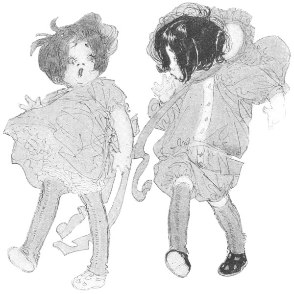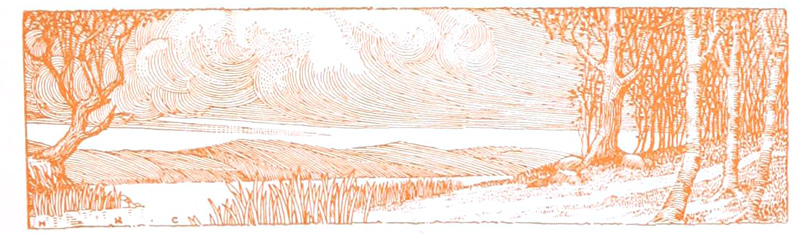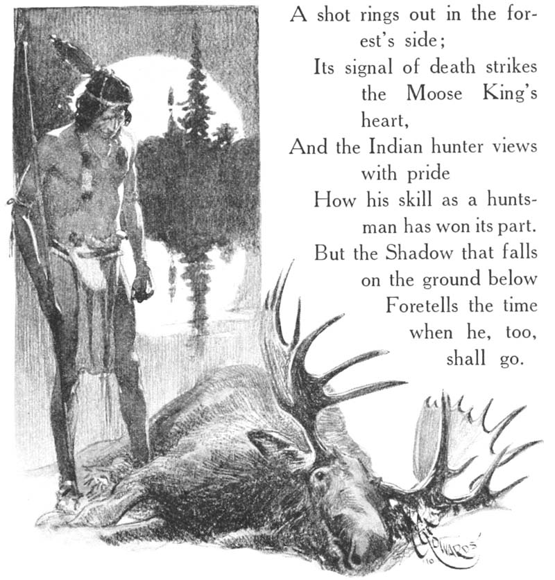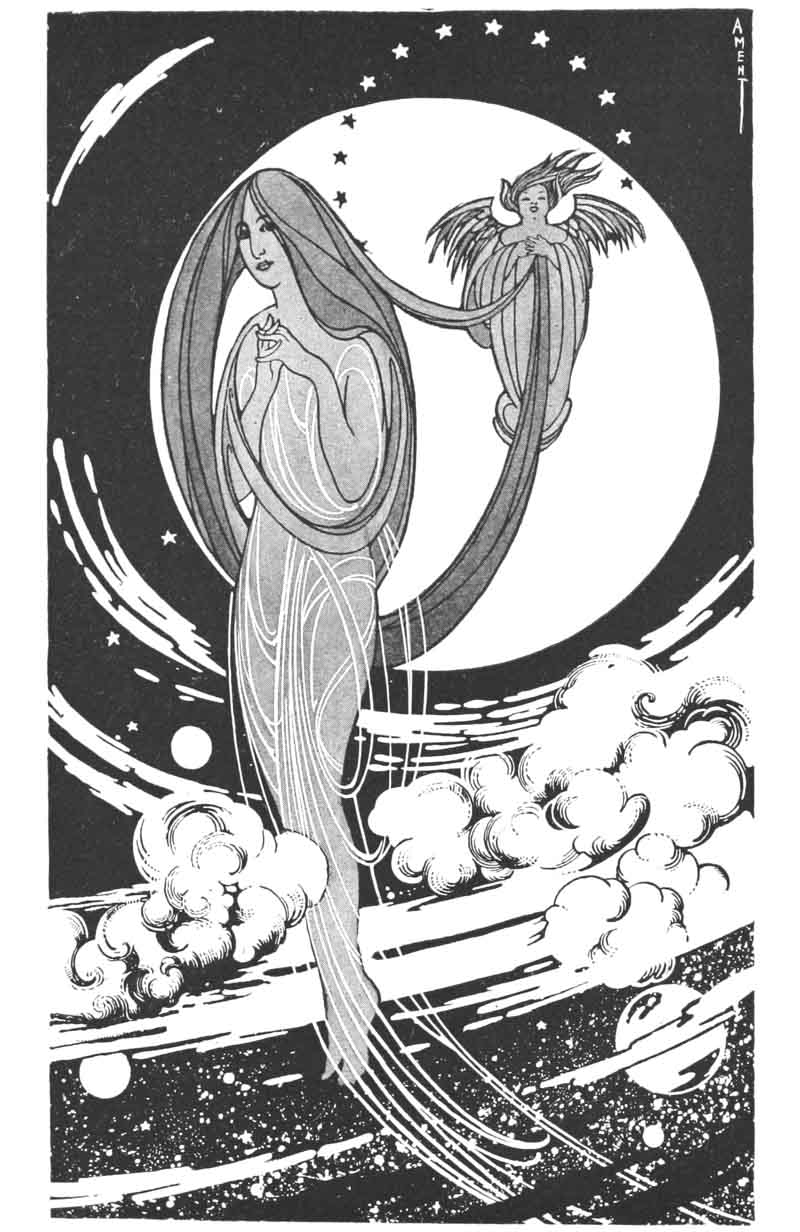 The Sun, vigorous and lusty, had rubbed his blinking eyes and hurried away to the west. The boy-child, Twilight, his chubby hands still clutching after the last red rays left behind by the Sun, winked his sleepy eyes, as, protestingly, he was pushed along in his crimson cart by Old Sandman. Close behind came his three sisters, the Evening Shadows, in their long, trailing, gray robes. A hush fell upon the Heavens. From far below came the hum of the Crickets and the low murmur of the Katydids, having their final good-night gossip, but in the Sky all was still until the Moonlady came softly creeping along, her silver mantle enfolding her slight form, her long silken hair caught by the Evening Breeze, who followed close in her wake. At her appearance there arose from the Earth songs of gladness and hymns of praise. Lovers looked up at her enraptured, poets sang of her, and even the brute creation sent Heavenward their low murmur of joy at her being. Silently she smiled down upon them all as she passed on her way.
