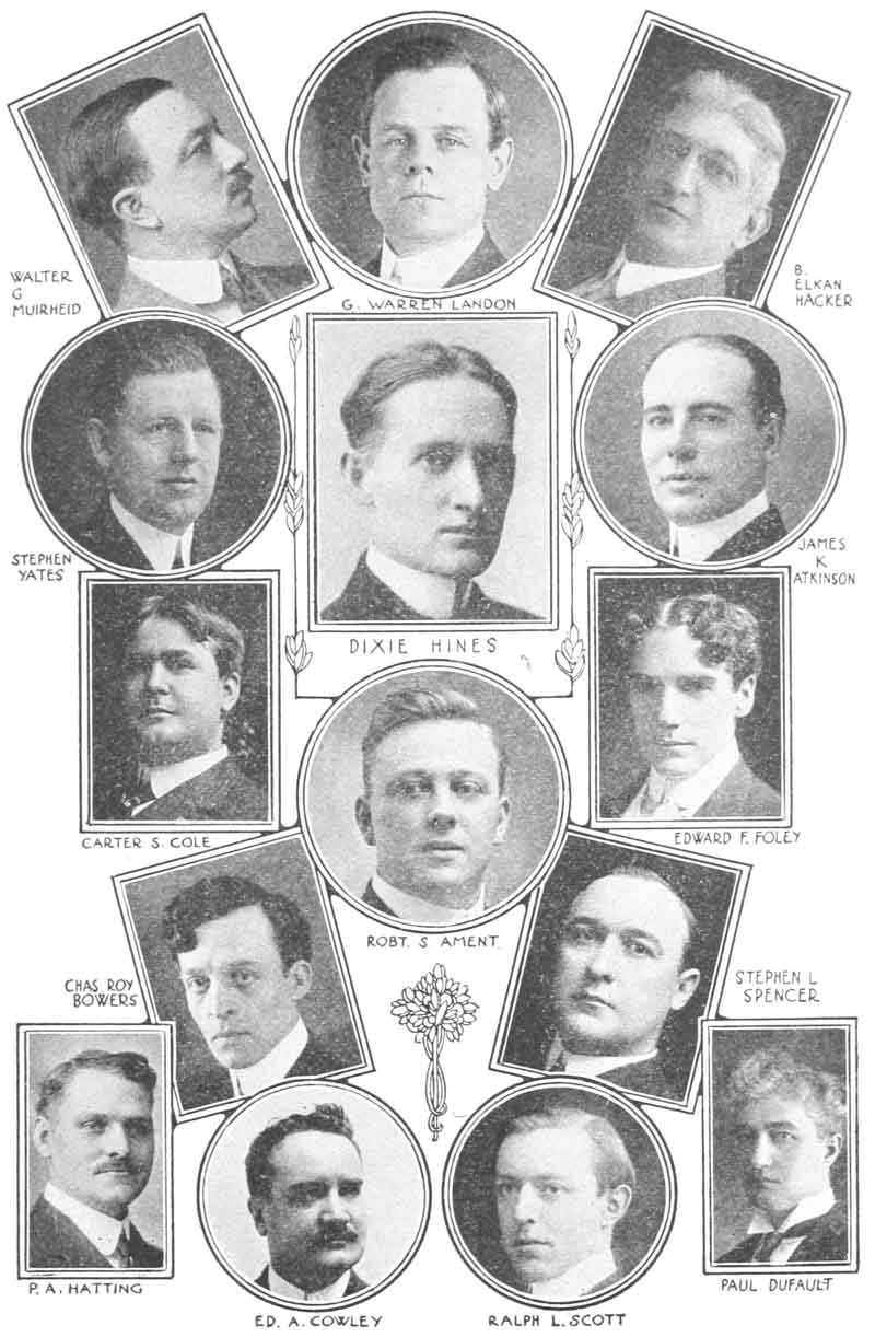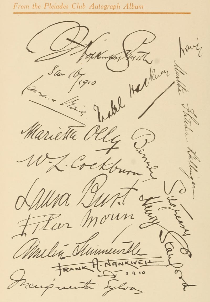 Near the end of the book there were five pages dedicated to Autographs of club members, two of which were blank, followed by a blank page, followed by a sort of collophon with an emblem and the name of the publishing company, followed by more blank pages. The autographs are retained, although we don’t know whether they were present in one or all printed copies of the book. The blank pages have been ignored in this transcription.