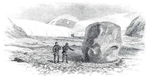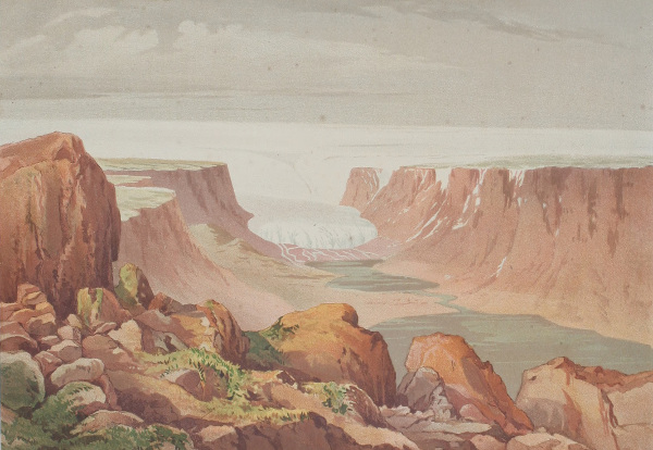 On reaching the summit we were amply rewarded for our expenditure of energy. The prospect was truly magnificent. A thousand feet below, the blue waters of Foulke Fiord lay, rippled with a breeze, under the richly-coloured cliffs of the opposite shore; further on, the flat expanse at the head of the inlet, with Alida Lake, and Brother John’s Glacier of Kane, shaped like a great paw, closed in the valley. Beyond and above all, a broad white plain, the vast inland ice of Greenland, lay spread before us. Even at first sight, this sea of ice could not be mistaken for a frozen sea, for its distant horizon was sensibly above our level.