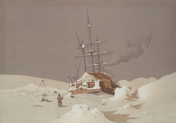 Our progress southward was a race against rapidly approaching winter. Snow fell in large quantities, and lay in thick paste on the water in cracks and pools. One by one the headlands passed on our northward voyage were rounded, and day by day new ice grew thicker and our stock of fuel dwindled. There several attempts were made to force a way past Cape Hawkes, and when we did succeed, the bay beyond was found full of new ice, so thick that the whole power of our engines could not push through. It cracked here and there before the ships, but soon brought both to a standstill, and the order was given to put out the fires.
