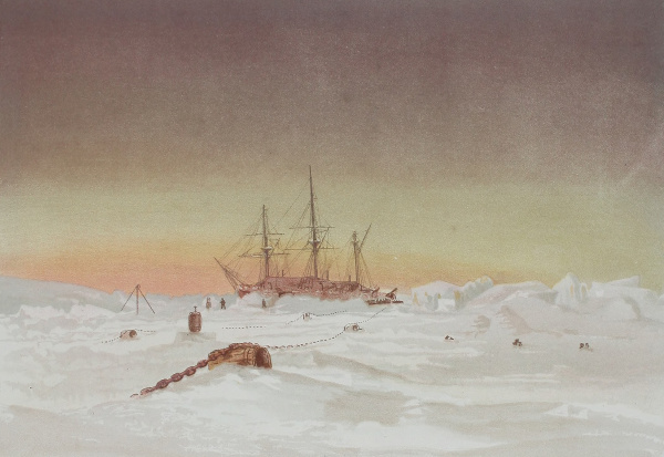 The bay in which we thus found ourselves arrested was afterwards called after Professor Allman. It is an indent in the western coast-line of Kane’s Sea, immediately north of Hayes Sound. It is five miles wide, and at its head we could see a large glacier pouring in two streams round a snow-covered hill, and fronting the bay in a line of icy cliff. Snow lay deep on the mountains on either side, and it still snowed constantly; decks and rigging were covered; a more wintry prospect could hardly be conceived. It was already beginning to grow dark in [82] the evenings, and lamps and candles were again in use between decks. But for a certain disappointment in being checked when we had made up our minds to return, few on board our ships were unwilling to face another winter. Here, two hundred miles further south, it would be a very different affair from the last. Release from the ice next season could be looked forward to as a certainty, and even with a stock of coal lessened by the exigencies of a second winter it would still be possible to escape from Smith’s Sound. If the ships could be got into shelter near the deserted Eskimo hunting-grounds of Norman Lockyer Island, we should probably get plenty of game. Almost all our invalids were again in good health, and when spring came the smooth floes would make the exploration of Hayes’ Sound a pleasure trip. Moreover, if a second winter was unavoidable, there was another reason—a somewhat ignoble one perhaps—why it would not be unwelcome. The advance of pay liberally granted by the Admiralty before sailing was not yet defrayed, and if we reached England this year almost all the men would still be in debt to the Crown, and sailors naturally prefer to land with a little money in their pockets.