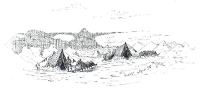 The hardships of sledging are made up of innumerable small worries. For the first two or three days we were all plagued with cramp; we could hardly bend up our knees to tie a moccasin or put on a foot wrapper without being obliged to kick out suddenly, overbalancing ourselves and our neighbours into a general mêlée, like a row at Donnybrook Fair. When the men began to get warm in their bags, muffled remarks about the cramp gradually gave place to smothered snores that would last till morning, and then the performers would wake with a firm conviction that they had never slept at all. On our first night of spring sledging the temperature fell to minus 35°, and many lay awake with the cold. Four nights afterwards it was nearly ten [58] degrees colder, but the tents were better banked up and the under robes and coverlet better laced together; some of us, moreover, had discovered that turning the mouth of the bag under and lying on it greatly increased the warmth. The officer is the outside man at the end of the tent away from the door. It is his duty to call the cook the first thing in the morning. It is no easy thing to wake at the right hour when the sun shines impartially all the twenty-four. The watch is often consulted two or three times before five o’clock comes. Then the cook turns out, lights his lamp, has a pipe, sets some snow melting, and scrapes down cocoa for breakfast; afterwards he walks in over his sleeping companions, and brushes down the snowy festoons of frozen breath hanging from the tent.