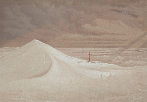 On 7th April, some difference of temperature in the still air treated us to a display of mirage. Almost all day long, as we marched forwards, the conical mountains of Cape Joseph Henry raised themselves up in pale shadow against the sky, and spread out into great flat table-lands, spanning the valleys with bridges, and constantly flickering into new shapes.
