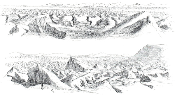 Half-a-mile northward from the depôt, a bank of snow, evidently the accumulation of ages, sloped down from a small hill to the sea. In one place a great slice of the bank had broken bodily from the mass above, leaving a deep crevasse. This was bridged over and completely concealed, except in two places, where the roof had fallen in and exposed its perpendicular walls of green ice streaked with layers of earth and sand. The bank was in fact a miniature “discharging glacier,” the only one yet met with on this coast. A few yards below the openings, the bridge was strong enough to bear the heavily-laden sledges of the western parties. Their course lay through the valley to the left, for though the snow on shore was in many places soft and deep, a short cut across the isthmus promised better travelling than the crush of floes round the cape. The prospects of the northern party were less encouraging. Looking northward from the hill over the crevasse, an icy chaos spread to the horizon. Mirage every now and then raised lines and flakes of distant pack into view, but all as rough and rugged as the ice-floes at our feet.