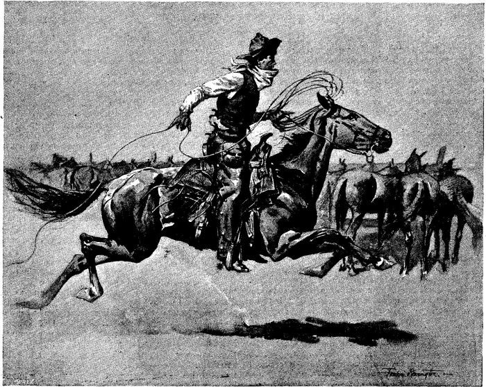 With all this before him, the beginner will speedily find out that life on a Western ranch is very far from being a mere holiday. A young man who desires to start in the life ought, if possible, to have with him a little money—just enough to keep body and soul together—until he can gain a foothold somewhere. No specific directions can be given him as to where to start. Wyoming, most of Montana, the western edge of the Dakotas, western Texas, and some portions of the Rocky Mountain States still offer chances for a man to go into the ranch business. In different seasons in the different localities business may be good or bad, and it would be impossible to tell where was the best place to start. Wherever the beginner goes, he ought to make up his mind at the outset to start by doing any kind of work he can. Let him chop wood, hoe, do any chore that will bring him in twenty-five cents. If he is once able to start by showing that he is willing to work hard and do something, he can probably get employment of some kind, although this employment will almost certainly be very ill paid and not attractive. Perhaps it will be to dig in a garden, or to help one of the men drive oxen, or to do the heavy work round camp for some party of cow-punchers or lumberers. Whatever it is, let the boy go at it with all his might, and at the same time take every opportunity to get acquainted with the kind of life which he intends ultimately to lead. If he wishes to try to ride a horse, he will be given every chance, if for no other reason than that he will continually meet men whose ideas of fun are met by the spectacle of a tenderfoot on a bucking bronco.