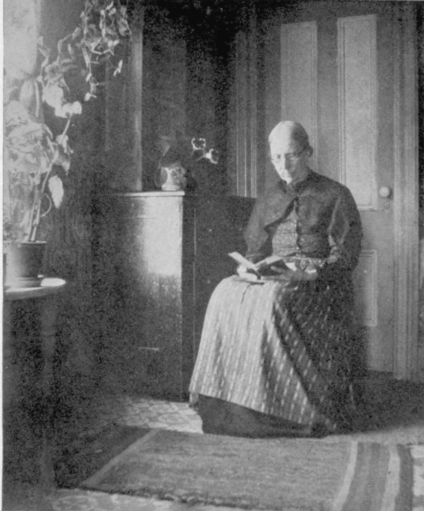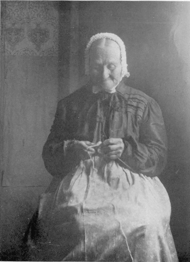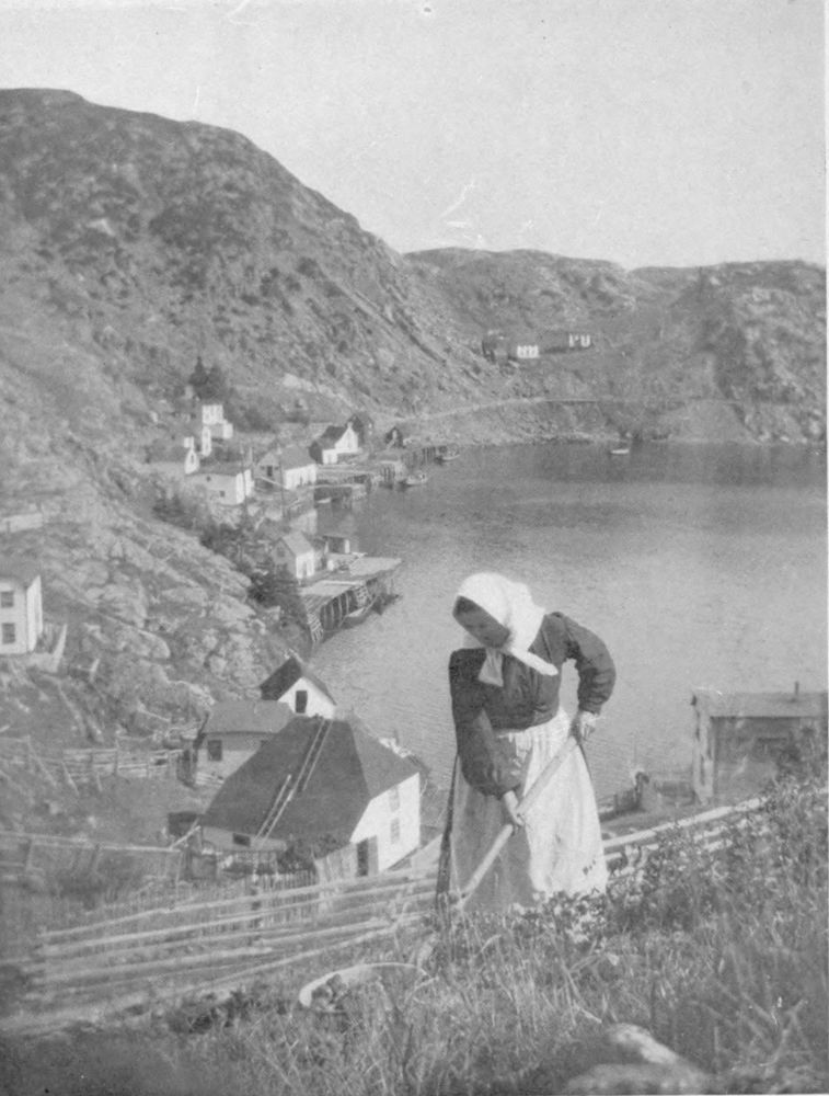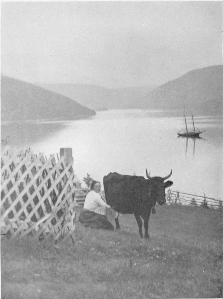 In addition to her fishing industry and tale of ships, Nova Scotia enjoys a pastoral side no less rich in genre. Farms are here. In following the highways and little by-paths rambling among apple orchards and gardens, potato fields and hay meadows—paths etched in Spring by the pink flush of apple-blossoms, or in autumn by boughs curving to earth under weight of rosy Baldwins or creamy Bellefleurs—one follows everywhere hard on the heels of romance. It is her hand that beckons into every little cottage snugly tucked away in valley and glen; where every grandmother sitting carding, spinning, hooking rugs, knitting or reading her daily portion of Scripture, can keep you entertained with tales and the recounting of interesting happenings and not go outside the range of the half-dozen houses which have been her little world for more than half a century.