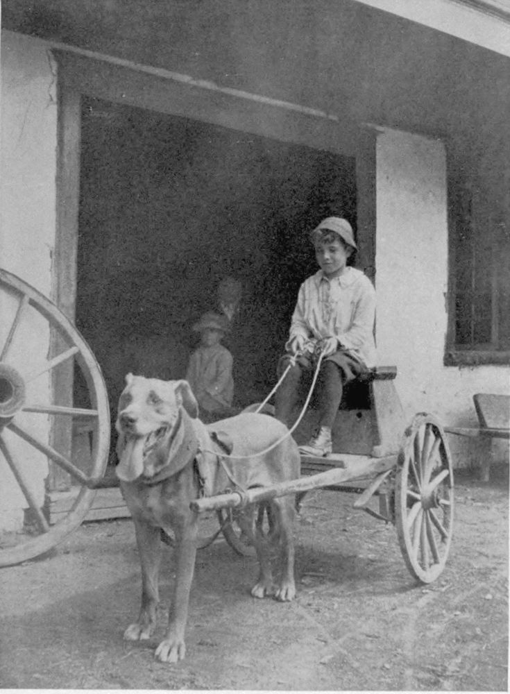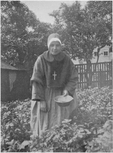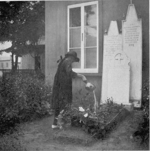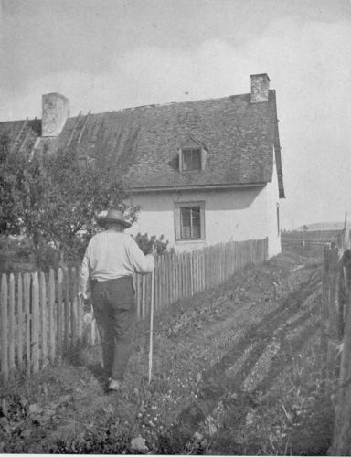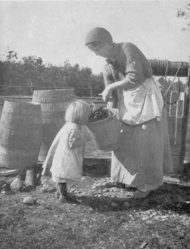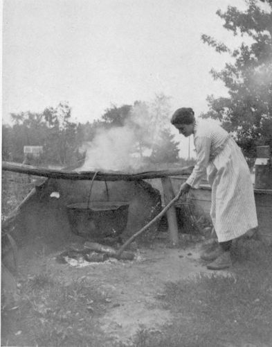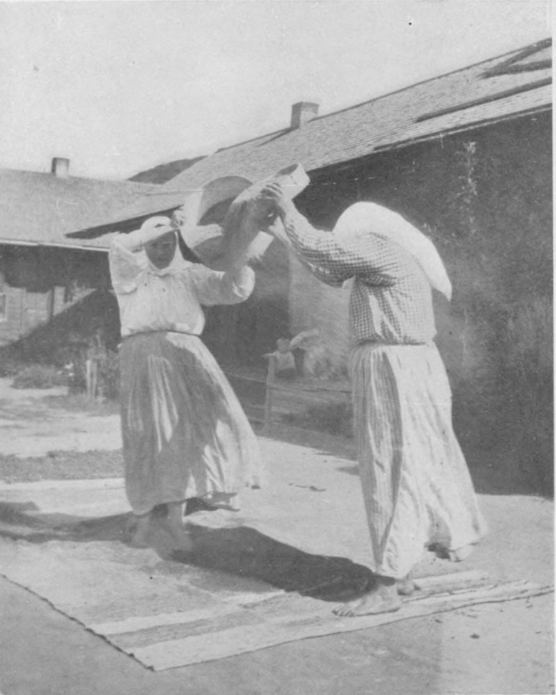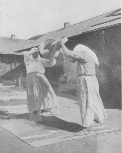 Stepping through the big Russian gateway into one of the yards, or all of them, reveals an almost interminable series of tableaux of heroic significance. Women with sieves in hand play them, full of seed, millet, etc., above their heads as dancing-girls the tambourine, in an effort to scatter the chaff on the breeze. Under their feet tarpaulin is spread to receive the grain or the seeds. From some doorway an old woman appears, with a broom of dried twigs, and brushes up a circle or a corner whereon to lay a mat. Laying aside the broom, she disappears around some corner to return with voluminous apron stuffed with beans in the pod. Sitting down on the mat she begins to belabour the beans with a billet of wood. Thus the shelling is accomplished. Two women appear carrying a plank between them. Presently they come again with a tub of apples already cut, and these they carefully spread to dry on the plank already brought. A mother appears out of a door, plotok on her head, a cup in hand, and begins to feed from the cup a little boy, with bread-and-milk, in which there is a dash of mustard. Other women are picking over tomatoes on the porch-floor. The cook for the week appears in the doorway of the great community-kitchen, seeking a momentary rest for her eyes, so long centred on her pots and pans with their contents, in the life and scenes going on in the yard. In the sun an old grandfather warms himself as he amuses his old age with making wooden spoons. Over there, two boys with their heads together are making a pair of nut-crackers by hammering two long wire nails into shape. Everywhere, there are flowers.