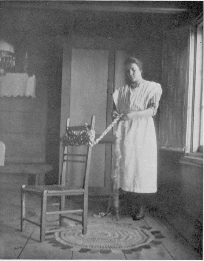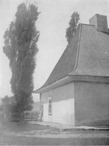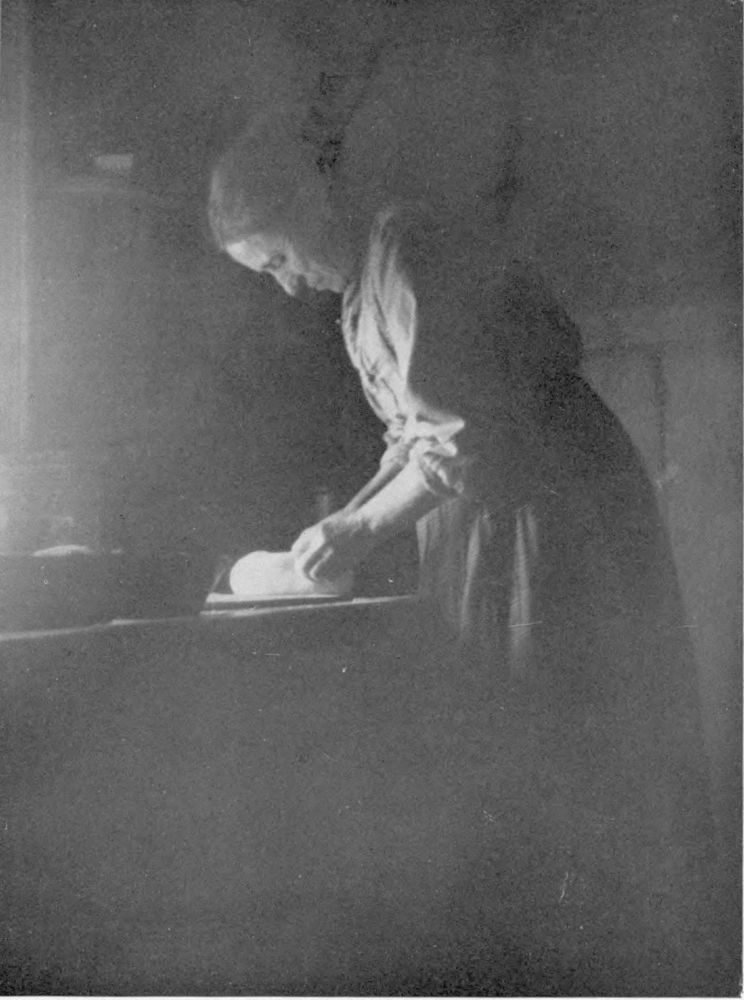 The interior of the “twins” presents no fewer pictures than the yards and the fields. The kitchen and the living room occupy all of the ground-floor. The kitchen is always a large room. In the middle of it stands an enormous brick oven wherein are baked innumerable loaves of brown bread. These loaves are always round and, for size, put to shame the “big loaf” of Quebec. After the bread is done, the pans are lined with straw, and, filled with fruit, are replaced in the cavernous mouth till the oven is full. Thus pears and apples are dried for the home-table. The dining-table is a long board resembling a giant carpenter’s bench and painted an art-red, standing across one end of the big room. Long benches serve the big table in lieu of chairs.