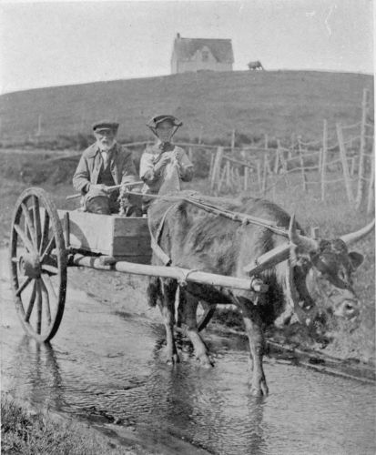 Riding away from this door, in one of the ox-drawn carts, always atmospheric and redolent of a romance denied to speedier transportation, one sets out to follow the barrel into the world, as it were. The ribbon road curves and turns by streams dashing under spreading willows or straight as a line it etches its way between rows of stately Lombardy poplars. We overtake other carts passing Grand Pré Church or standing idly for the moment before a local smithy, one ox looking as if Nirvana had descended upon him, while his fellow steps inside and endures the agony attending the acquisition of a pair of new shoes, the world over. Past creaking carts we go with oxen straining under full loads on their way to the large shipping centres of the railroad. It is a countryside glowing with crimson and yellow, and placid as only autumn that still lingers in the lap of summer, can be. Presently we come to the orchard where we would be. And there the family is gathered, laughing and chatting, waiting for barrels, for orchards and many hands give the cooper and the carter all they can do to supply them with the sweet-smelling barrels.