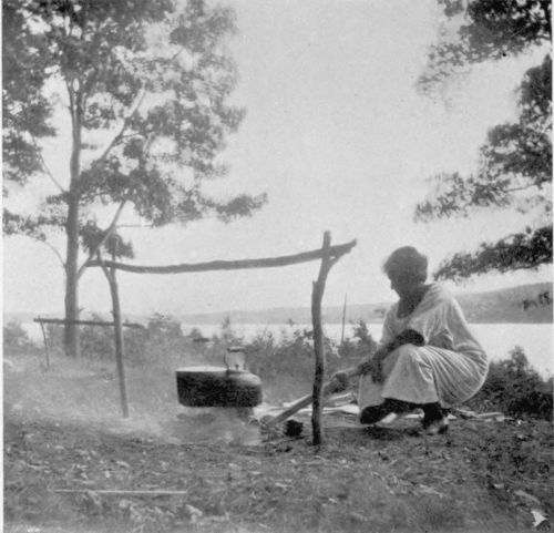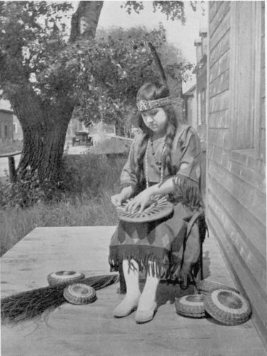 In the community-house no one seems to mind, but all squat around in the semi-darkness and smoke, hugging knees and drawing on pipes, gazing in meditative silence at some old fellow{251} stirring a pot of boiling rice perched in the elbow of the burning stump, with a wooden spoon, blackened and polished with age, and of a pattern suggesting the unearthed treasures of Thebes. Over at one side of the room, in a compartment partitioned off by cracker-boxes and blowing curtains, and all open on the side facing the fire, sits an aged woman, claiming to be a hundred years at least, and how much older—who can tell?—weaving pretty little baskets to sell to visitors from the boats. Despite her great age, the old woman has all her faculties and is really an interesting personality, dyeing some of the roots and straw and weaving fancy patterns into her basketry. In the room on the opposite side of the cracker-box partition, another woman kneels before a crude loom, on which hangs a half-woven blanket. From out the gloom of distance the man interested in the rice fetches an armful of sticks and under their influence the fire leaps into a big blaze, revealing more compartments in which women work, or sick children lie in bed looking wistfully at the leaping fire. In some enclosures no one is at home, but outside on the boardwalk in the dusk of the evening, wending our way homeward to our room in the old Mission-house, we often met the squaws returning from the woods, large hand-woven baskets of scarlet huckleberries, neatly covered with cool sprigs of evergreen, strapped to their backs by hand-embroidered bands of wampum. Next morning little pats of drying fruit, set breast-high on a clean pine board on a post between the sea and the boardwalk, with a man’s hat and coat hung over them to scare off the crows of which there are great numbers at Alert Bay, give one an inkling that even the Indian woman has heard the echo of the “Preserve or Perish” slogan of her more southern sisters and is doing her “bit”.