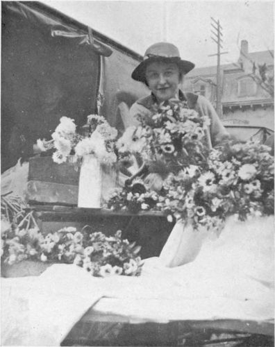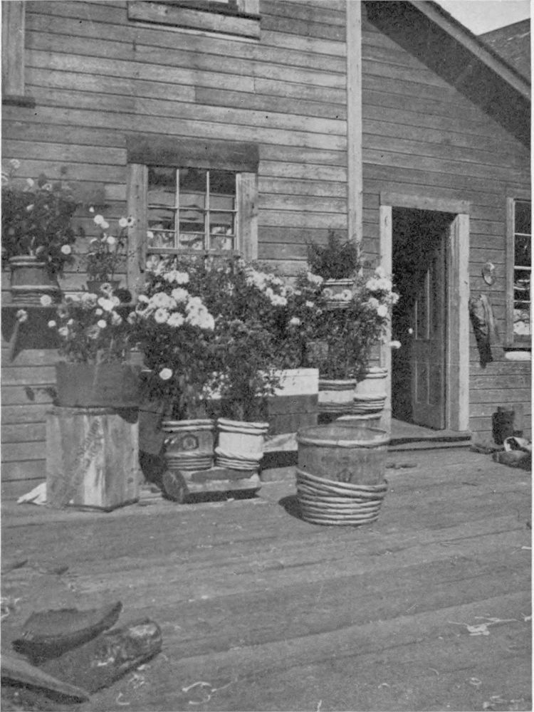 Who can screen a picture of Japan without a bridge, or of a Japanese home, however homely, but its poverty is beatified by masses of flowers? So, here against the unpainted walls, set about on the floor of the wooden yard, are buckets and tubs of Chrysanthemums a-bloom, Japan-transplanted. And do the flowers stop at the bucket or the box? Not at all. Marigolds and cornflowers and candytuft and many others under the loving hand of the Jap-mother, are coaxed out of every crevice of river-silt staved-up by any old bit of wood. Vines set near the edge of the tiny canals trail tendril fingers to touch the water. And the little bridges are so invaded by pots of bloom that the man of the family must surely object to the narrow gangway allowed him to and from his boats, did he not love flowers as keenly as his little Flower-of-Japan wife.