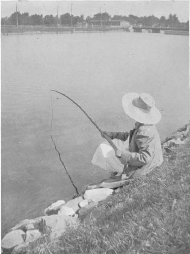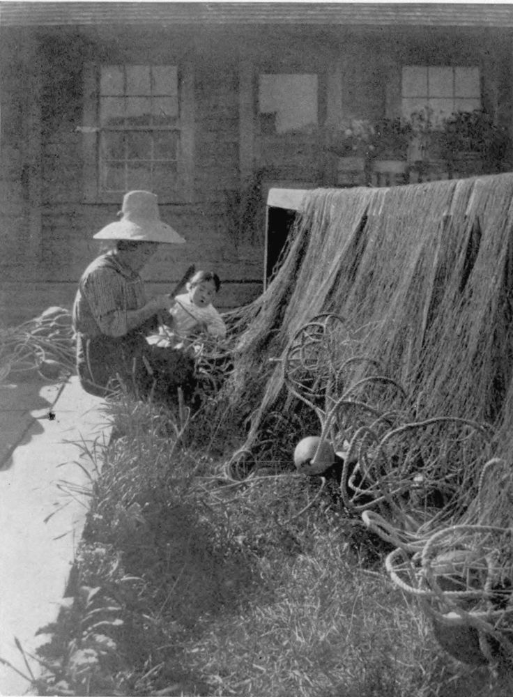 As one steps along the factory-floors between the long rows of women, figures just made by Nature for the kimona and the smooth shiny ebon-elegance of the Japanese coiffure, these plump little women with their brown-eyed babies on their backs are indeed a picturesque contribution to the genre appearing on the vast stage from Atlantic to Pacific that is—the Dominion. Nor is canning the fish the limit of the Japanese woman’s usefulness. Not all of them work in the factories. Figures of the wharf-side and of the platform-yards by the flowering banks of the canals are the great seines a-drying. And while one sees men, sitting about in the sun, netting-needle in hand, mending these nets, just as frequently one happens on some strong Japanese woman, long knife in hand, cutting away the large wooden floats, against the net’s being laid away at the close of the season, her baby, released from the back cradle-perambulator, playing at her side.{243}{242}
