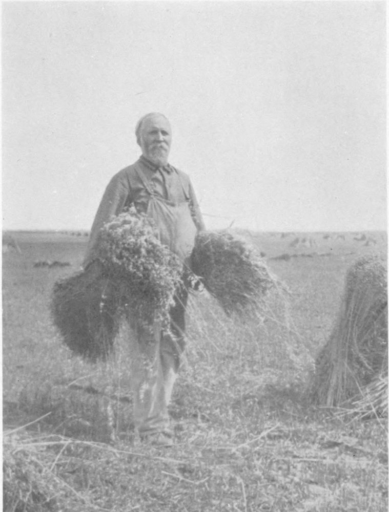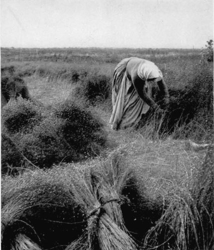 In the fields at Verigen one comes upon the figure of a woman stooping over and seizing in her strong hands a full handful of the tall plants. These she pulls and ties with a twist of green into a sheaf. “Flax must be pulled”, she tells you. In response to inquiry as to the quality and length of the fibre in this Canadian flax, she raises herself to rest awhile, and drawing a wisp through her fingers says half-reminiscently “Oh, good, vera good. Vera long fibre.”