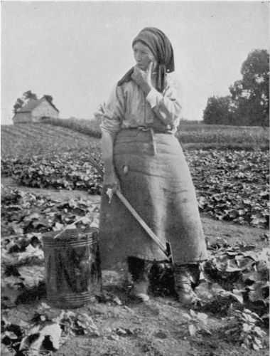 Here is a group of women in a field of sunflowers, some passing from plant to plant plucking the seed-discs into their aprons and carrying them to a group of women and children sitting about a big mat. This scene resembles some religious festival, the women and girls with white plotoks on their heads and sticks in their hands beating, on the reverse side of the seed-plate and the seeds falling, like a rain, in a drift on the old tarpaulin.