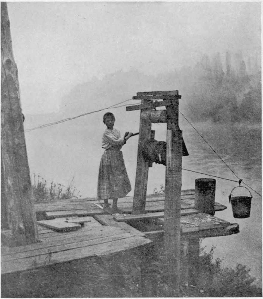 The British Columbia woman “rets” her flax in the river. And she keeps the swift current from running away with her precious plants, by weighing them down with the rounded river-stones, the smoothed product of the ice-age. These smooth stones serve the Indian-woman as pestles for the stump-mortar wherein she grinds her corn, and this Russian woman turns them to service for anchoring her flax, as though they were made to order. A week or ten days and the flax, now clear of all wood-fibre, is given the final washing and then carried up the steep bank of the river to sway in the wind, the while it dries on some “village” clothes-line. After this it comes into the hands of the heckler and the spinner, in every odd moment between drying fruit, picking beans, winnowing seeds, gathering aprons full of ripened millet and the thousand and one tasks the hand finds to do on these almost self-supporting farms.
