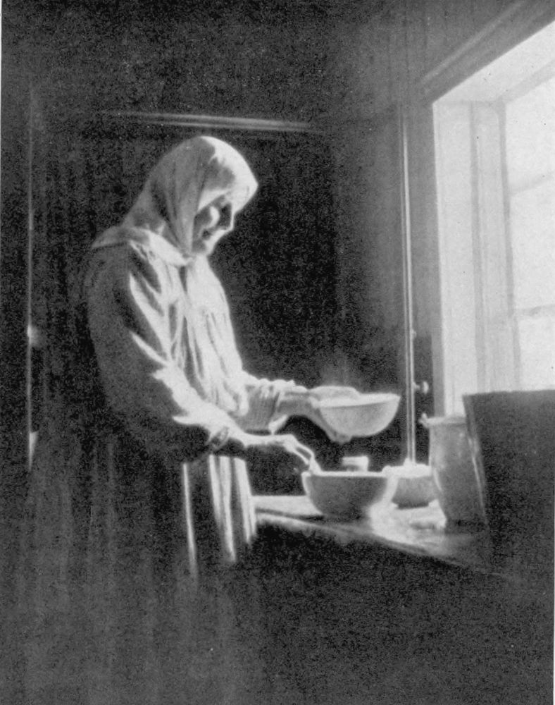 all sorts of vegetable pies, beets, carrots, cheese, little triangles blanketed in a pastry of millet or a mixture of brown flour and white, make up one of these vegetable meals, all being completed by unlimited draughts of Russian tea sweetened and flavoured with raspberry or black-currant jam. The women take turns at the cooking, a week at a time, and as there are usually six or seven women in each village, no woman is worn-out at the stove, but each has a six-week interval before the wheel of time brings her turn round again.