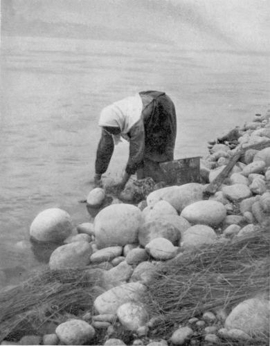 But it is the Indian of the week-day, the Indian going about his business, that spells the most interest after all. A stroll along the boardwalk then reveals sights that have to do with subjects of world-wide interest—like food supplies and women at work. For it is the Indian woman (kloochman) who does the work, as board-walk scenes so frequently demonstrate. A group of squaws—bending low, heads together—on the grass at the front door of a cottage are trussing up a dozen juicy salmon between home-made frames of clean pine-sticks. A little nearby shack, from every crevice of which an acrid smell proceeds, proclaims the “smoke-house”. A proper fire is revealed every time the crude door swings on its creaking hinge to admit another fish to the council of its peers. A little farther along, an old squaw sits crouched on a shawl on a float under the wet pier-head, cleaning, opening and splitting salmon from a loaded kayak. Every now and then talking to herself, she works away with a will, while you, looking on from above, wish you understood enough of her guttural talk to tell whether she herself was the Izaak Walton of this good catch or whether it was her lord and master, who has walked off and left her all the dirty work of preparing the fish while he squats on the bench in the little summer house that forms part of the sea wall, and smokes.