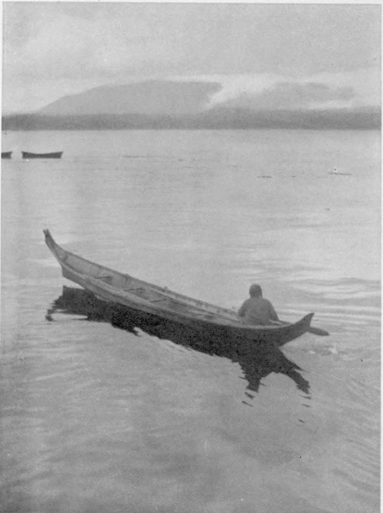Sunday at Alert Bay offers rare opportunities to the visitor. Dropping in to church in the morning, it is indeed a novel service one happens on, all the old familiar prayers and hymns in the strange tongue that seems to express only k, w and a sounds! After church an incoming steamer with passengers from the North offers a very satisfactory excuse for a stroll along “Totem Avenue”, where Indians of all ages sit sunning themselves, or are arriving and departing in family groups in the kayak to visit some distant settlement far up the Nimkish. The young folk in their civilized and rather good, if somewhat bright-coloured “Sunday bests”, are all down on the Cannery pier, seeing the crowd come off the boat. The older women, not caring for such “modern proceedings”, paddle off alone in kayaks to gather driftwood from the opposite{250} shores of the bay; the shore-edge of the tree-cemetery being an excellent “catch” for the “chips” that are the gift of the sea.