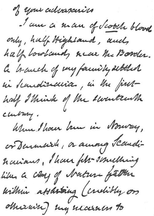 I am a man of Scotch blood only, half Highland, and half Lowland, near the Border. A branch of my family settled in Scandinavia, in the first half, I think, of the seventeenth century.