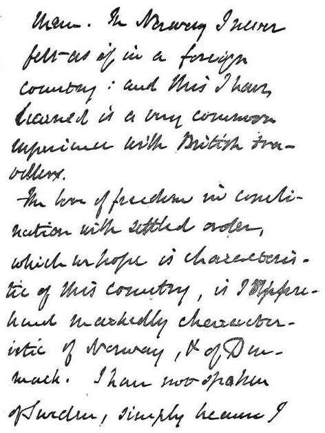 When I have been in Norway, or Denmark, or among Scandinavians, I have felt something like a cry of nature from within, asserting (credibly or otherwise) my nearness to them. In Norway I have never felt as if in a foreign country; and this, I have learned, is a very common experience with British travellers.