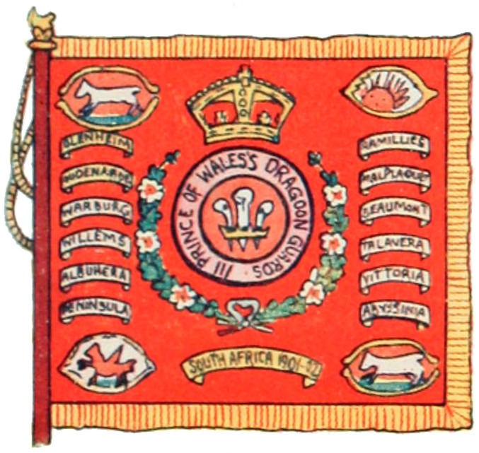 “The King’s Own Royal Regiment of Dragoons, commanded by John, Lord Churchill.—The colours to each troop thus distinguished: the colonel’s, the royal cypher and crown embroidered upon crimson; the lieutenant-colonel’s, the rays of the sun, proper, crowned, issuing out of a cloud, proper, and is a badge of the Black Prince’s. The first troop has, for colours, the top of a beacon, crowned or, with flames of fire proper, and is a badge of Henry V. The second troop, two ostrich’s feathers crowned argent, a badge of Henry VI. The third, a rose and pomegranate impaled, leaves and stalk vert, a badge of Henry VIII. Fourth troop, a phœnix in flames, proper, a badge of Queen Elizabeth; each embroidered upon crimson.