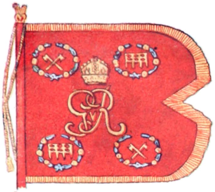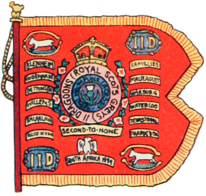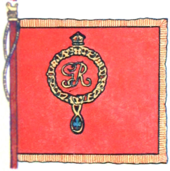 “The King’s Own Troop of Horse Guards and Troop of Grenadiers.—The standard, crimson with the royal cypher and crown; the guidon, differenced only from the standard by being rounded and slit at the ends.