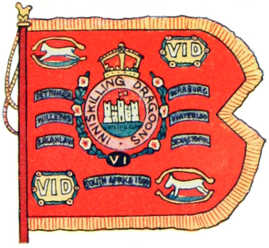 “The King’s or first Standard and Guidon of each Regiment to be Crimson, with the Rose and Thistle, conjoined, and Crown over them, in the Centre: His Majesty’s Motto, ‘Dieu et mon Droit,’ underneath. The White Horse in a Compartment in the first and fourth corners; and the Rank of the Regiment in Gold or Silver Characters on a Ground of the same Colour as the Facing of the Regiment in a Compartment in the second and third Corners.