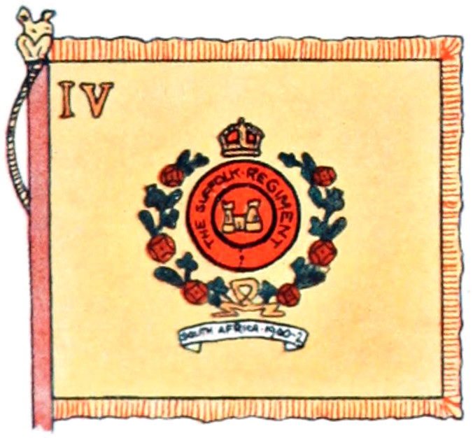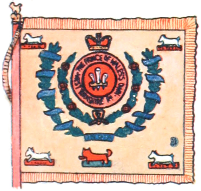 “The second and third Standard and Guidon of each Corps to be of the Colour of the Facing of the Regiment, 18with the Badge of the Regiment in the centre, or the Rank of the Regiment in Gold or Silver Roman characters, on a crimson ground, within a Wreath of Roses and Thistles on the same stalk, the Motto of the Regiment underneath. The White Horse, on a red ground to be in the first and fourth Compartments; and the Rose and Thistle conjoined upon a red Ground in the second and third Compartments. The distinction of the third Standard or Guidon to be a figure 3 on a circular ground of Red underneath the Motto. Those Corps which have any particular badge are to carry it in the centre of their second and third Standard or Guidon, with the Rank of the Regiment on a red ground within a small Wreath of Roses and Thistles in the second and third corner.”
