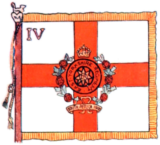 “Her Royal Highness, the Duchess of York and Albany’s Regiment of Foot (4th King’s Own) flies a 11red cross in a yellow field, bordered white, with rays, as that of the Admiral’s, with H.R.Highness’s cypher in the centre.”