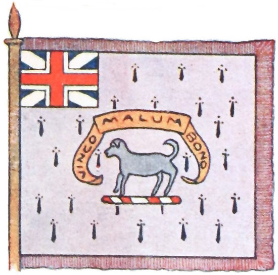 “The Queen’s Regiment of Foot, commanded by the Hon. Piercy Kirk, flyes a red cross bordered with white and rays as the admirals (see below), in a green field, with Her Majesty’s royal cypher in the centre.