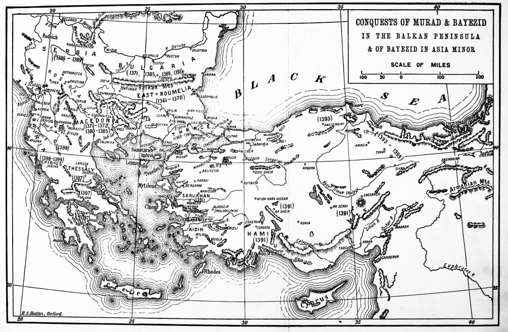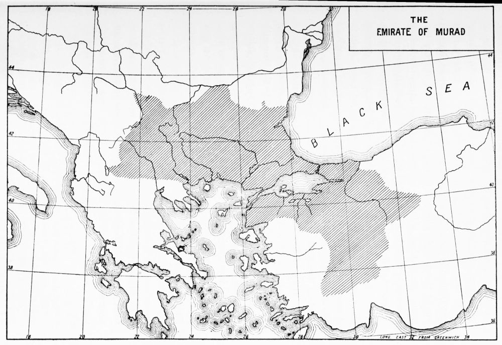 Nor were the Osmanlis, until the reign of Bayezid, one hundred years later, the strongest military and political factor in Asia Minor. The Turkish emirates of Sarukhan, of Kermian, and especially of Karaman, could match the Osmanlis in extent of territory and ability to defend it.[36] We shall see later how the Osmanlis conquered their Anatolian neighbours by a prestige won in Europe and by soldiers gathered in Europe. One of the principal tasks of this book is to correct the fundamental misconception of the foundation of the Ottoman Empire, which has persisted to this day.[37] It seems to be a pretty generally accepted idea that the Osmanlis were a Turkish Moslem race, who invaded Asia Minor, and, having established themselves there, pushed on into Europe and overthrew the Byzantine Empire. Nothing could be farther from the truth. The Osmanlis were masters of the whole Balkan peninsula before they had subjugated Asia Minor as far as Konia!