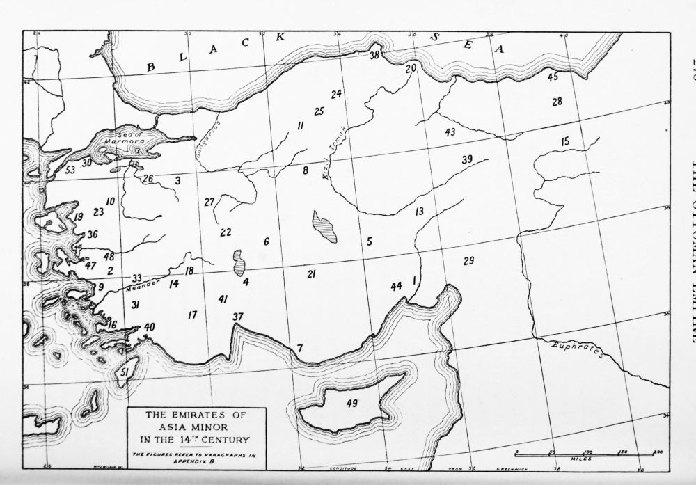 During this first decade of the fourteenth century, the Byzantines had lost control of practically all the Aegaean{43} Sea, and had to struggle for a passage through the Sea of Marmora. After the recent Balkan War, the Sublime Porte presented a memorandum to the Powers, in which it was stated that the possession of Rhodes, Lesbos, and Chios was absolutely essential to a maintenance of Ottoman power in Asia Minor. History, from the time of the ancient Persian wars to the present day, confirms this point of view. So, before taking up the progress of Osman’s conquests, it is important to note that during the years of Osman’s conflict with the Byzantines Chios and Rhodes passed out of their hands.