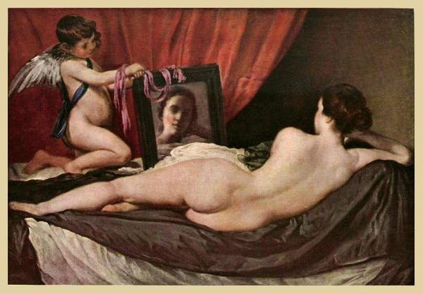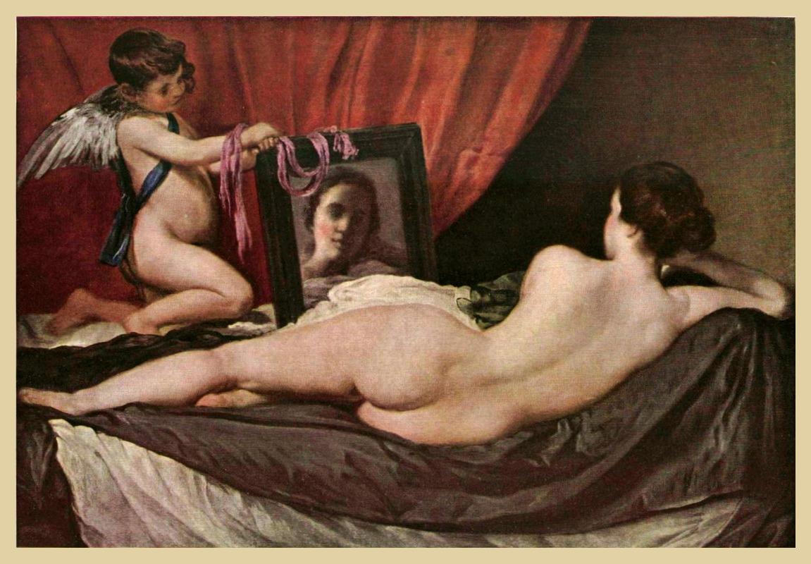 Comme Velazquez est Espagnol, il a choisi en Espagne le modèle de la splendide Vénus couchée. Elle a toute la souplesse des Castillanes à la taille mince et l’opulence des formes qui sont l’apanage des femmes sur l’autre versant des Pyrénées. C’est bien également un authentique visage d’Espagnole que reflète le miroir; visage aux joues pleines, où l’harmonie des lignes et la régularité des traits se 25 marient à une énergie dans l’expression qui est la caractéristique de la beauté castillane.