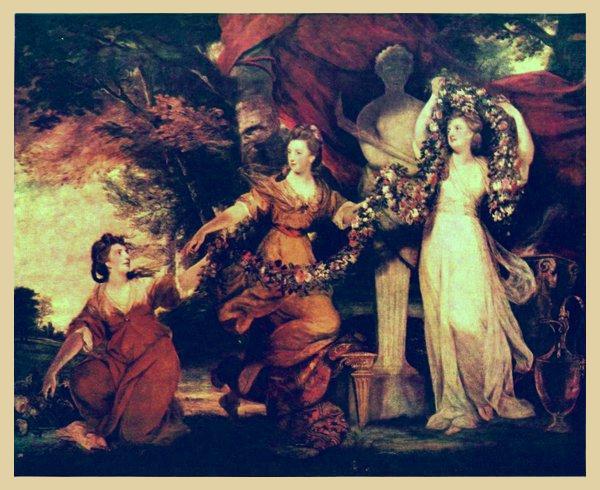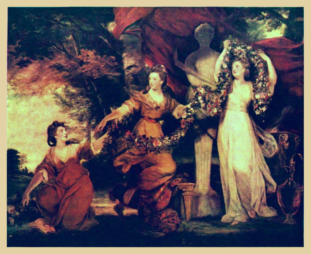 Tel est le cas pour le tableau reproduit ici. Ces trois Grâces vêtues à la dernière mode londonienne du XVIIIe siècle n’ont rien de l’esthétique usitée dans ce genre de sujets; ce sont de véritables Anglaises que nul trait n’apparente aux classiques beautés que peintres et sculpteurs ont l’habitude de nous montrer. Blondes comme il sied à des filles du Nord, élancées, fines, elles ont cette fraîcheur délicate et cette grâce aristocratique dont l’Angleterre possède de si nombreux et si charmants modèles. Ces trois Grâces sont trois sœurs, filles de Sir W. Montgomery: celle de gauche, qui est agenouillée et tend des fleurs à ses compagnes, est Mrs. Beresford; celle du milieu, dont le genou ployé s’appuie sur le soubassement de la stèle, est Mrs. Gardiner, mère de Lord Blessington; enfin, nous reconnaissons la marquise Townsend dans la superbe jeune femme qui, dans ses mains levées, déploie la guirlande odorante et fleurie destinée à l’Hymen.