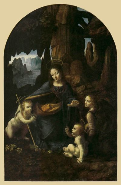 LA scène se développe dans une caverne bizarrement découpée, en décor romantique, et formée de roches et de feuillages. Par les ouvertures de la caverne s’aperçoivent les eaux d’un lac bordées de rochers escarpés, et qui reflètent l’azur d’un ciel très pur. Lumière éclatante au dehors, ombre et fraîcheur au dedans. C’est dans cette ombre propice que le grand Léonard a placé le groupe divin.