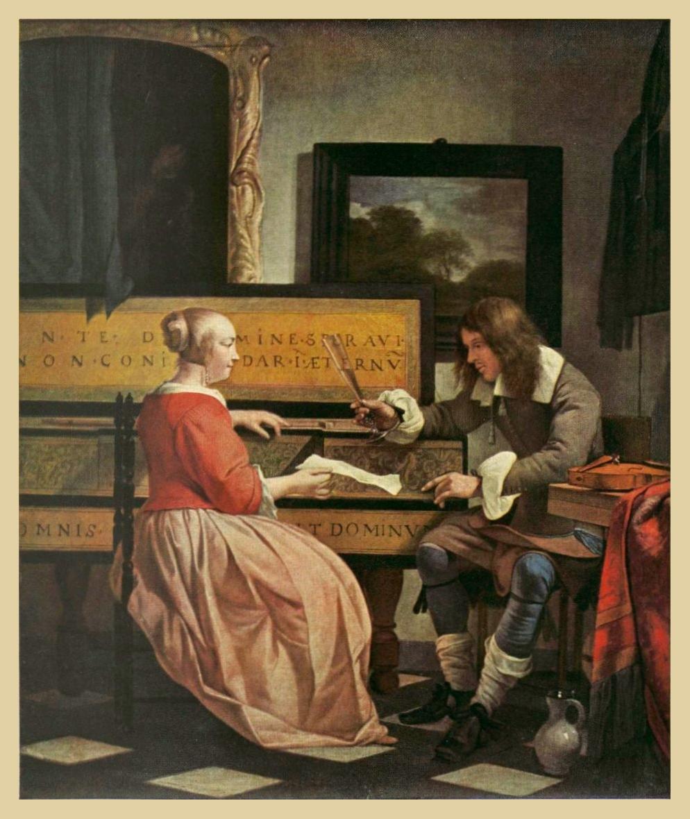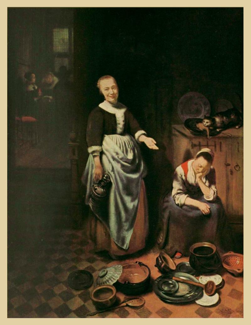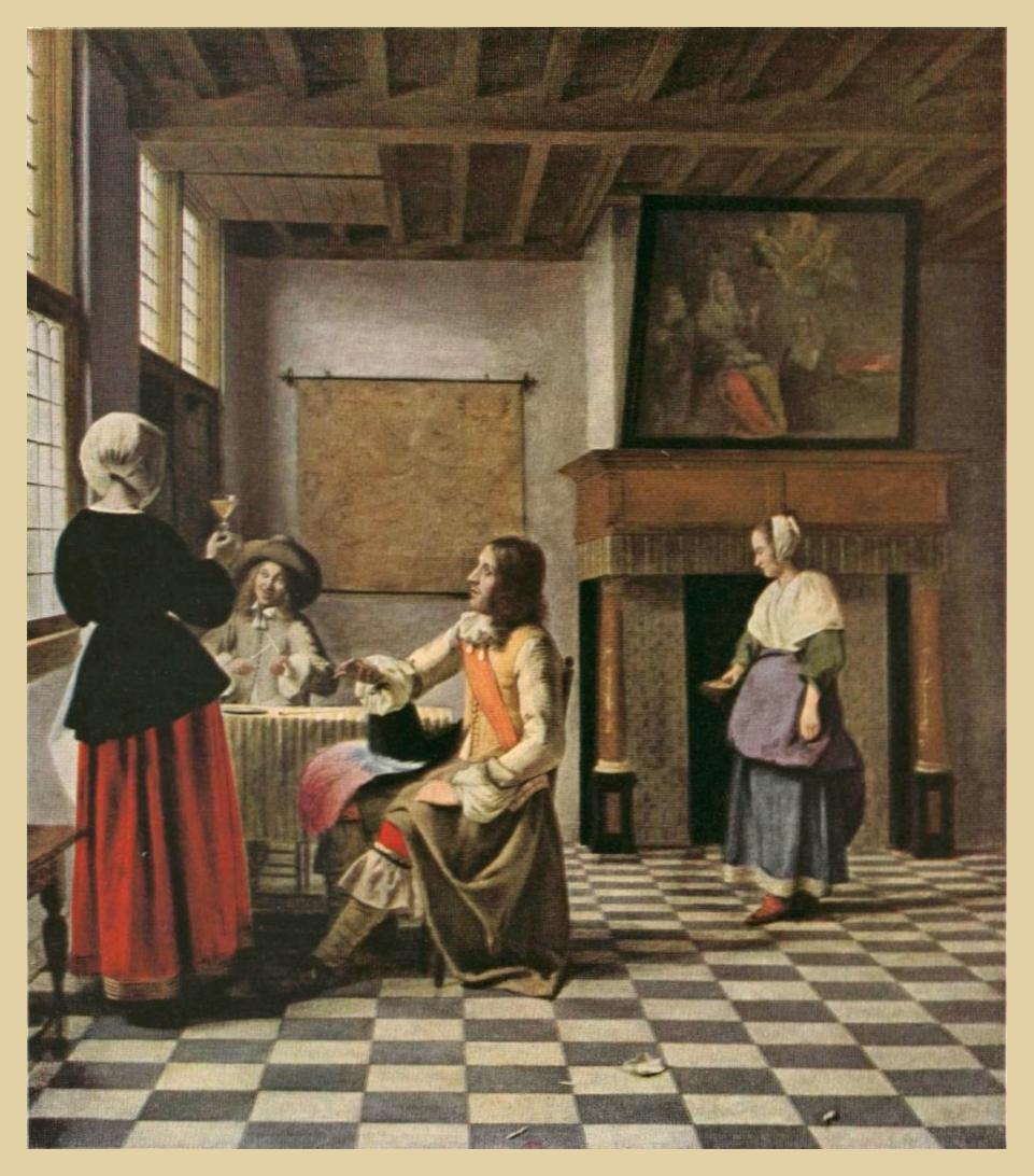 Peter de Hooch l’emporte encore par une traduction beaucoup plus libre et beaucoup plus large de la vie hollandaise. 19 Aussi précis que Gérard Dow et Metsu, il évite de tomber comme eux dans la minutie exagérée du détail. Il y a plus d’ampleur dans sa peinture, plus d’élévation dans son style.