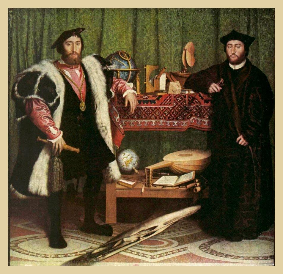 Le magnifique tableau des Ambassadeurs, un des chefs-d’œuvre d’Holbein, fut peint en 1533. Entre 1790 et 1795, il passa par vente aux mains du comte de Radnor et resta dans la famille jusqu’en 1891. A cette époque, la “National Gallery” l’acheta à un prix très élevé et le plaça dans la salle XV réservée à la peinture allemande.