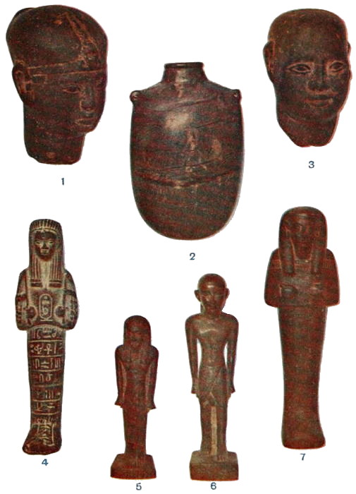 I obtained four specimens (see Plate XVI), of undoubted antiquity, although even these 145are examples made in or for Nubia about 3500 years ago of Egyptian Funerary objects of New Empire period (reign of Thothmes III).