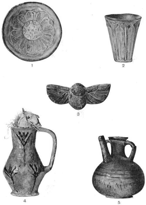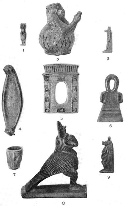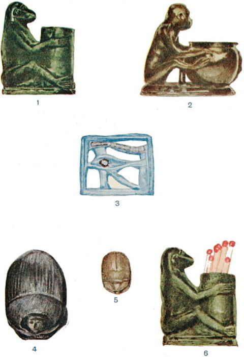 The largest scarab is of very poor workmanship. The head, which took the unusual form of a sphinx, was badly made and proportioned, and was turned slightly to one side. The workmanship of the smaller scarab was also poor. The sacred eye was well made, of a beautiful blue, and looked as if it had only just left the workshop. The monkey was one of the most startling things I have ever seen found in an excavation in Egypt. The glaze was modern and the whole thing looked as if it had recently come out of a cheap bazaar. But there can be no question about the authenticity of these things, for they were found and taken out of the graves by the archæologists of the Nubian Survey.