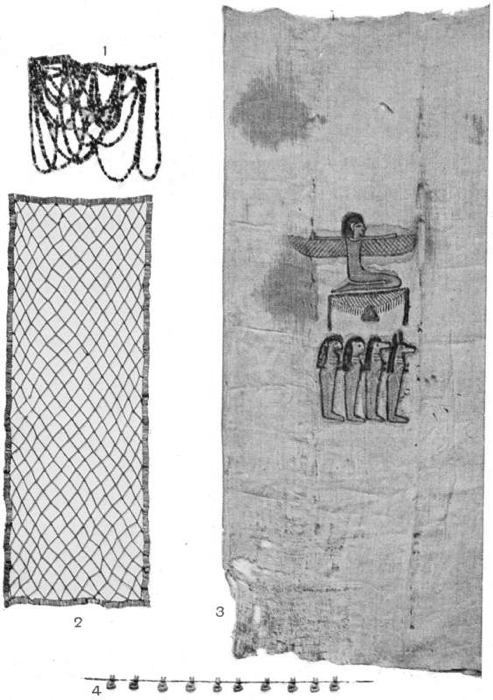 The mummy cloth of ancient times was made with the warp and woof of different thicknesses—the warp being thicker than the woof, so that it would hang and fold better. The piece of mummy cloth shown in Plate XV, No. 3 is genuine, but the painting on it has been done recently, as one may be pretty sure from several signs. The painting has been put on with a brush, instead of having the design outlined with a reed and then painted. The colour has run, and shows beyond the edge of the design; and the cloth, being dirty, shows signs of where the paint has wetted it. It may belong to the twenty-second dynasty.
