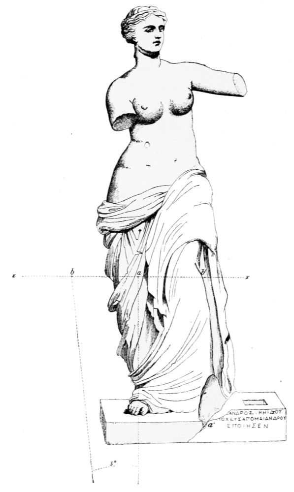 THE famous French painter David happened to be in exile at the time of the discovery of the Venus of Milo, and, taking an especial interest in this wonderful piece of ancient art, he induced one of his disciples, a certain Debay, to have his son Auguste Debay, a young art student, make a drawing of the statue as soon as it was put up in the Louvre. This drawing was afterwards published by M. de Clarac in his “Notice” and we here republish it on account of the importance it has gained as a document in the history of the statue.