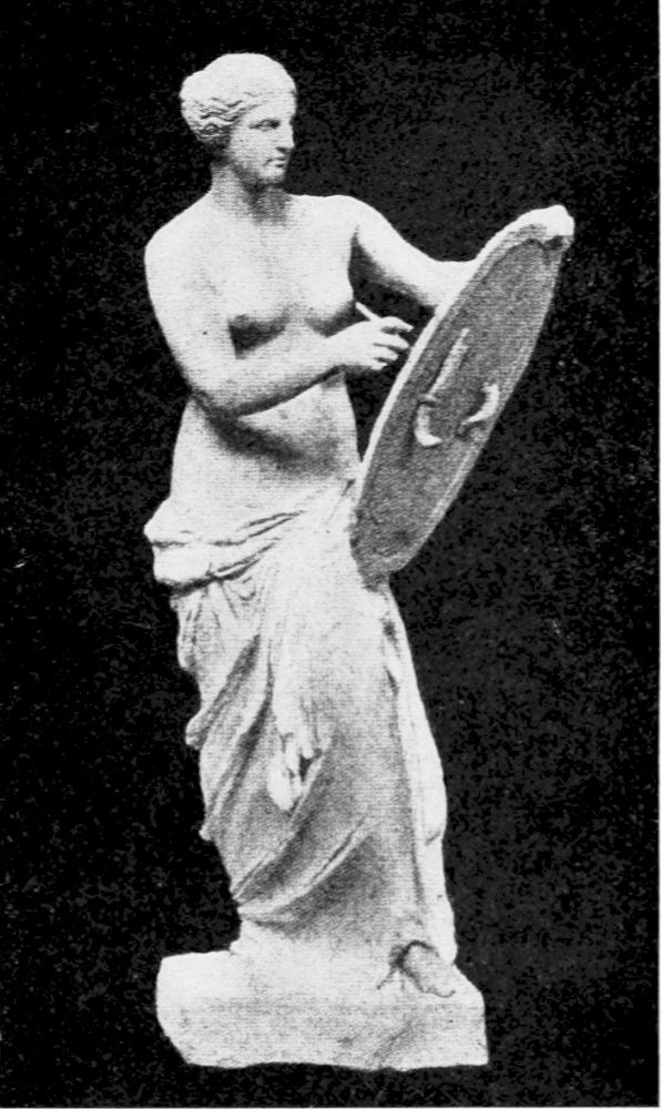 Those restorers of the Venus of Milo who reject the genuineness of the right hand holding an apple enjoy the greatest liberty in their work of reconstruction, and we find some of them representing{31} our Venus as holding a shield on her knee and writing upon it. Others assume that her right hand holds a mirror, while still others who claim that there is no necessity of interpreting the statue to be a Venus, believe her to be a Victory or Niké, and put wreaths in her hands.