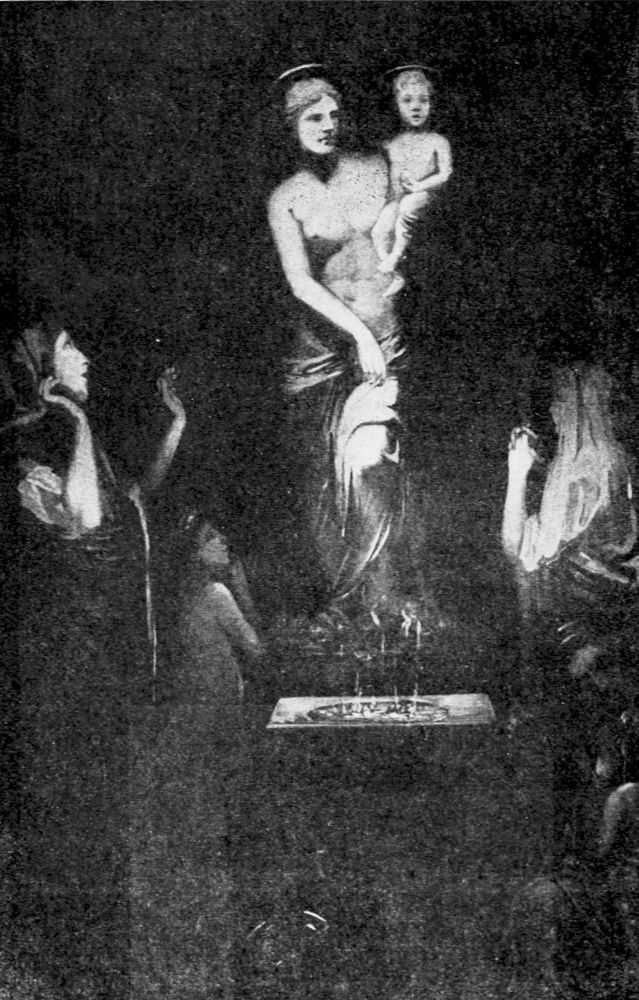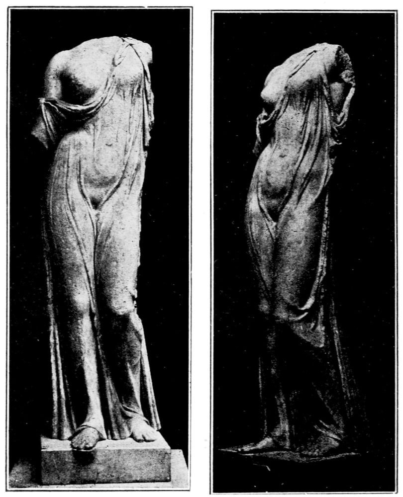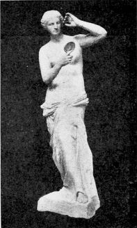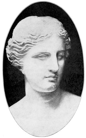Our Blessed Lady of Milo, as we may call this beautiful representative of Greek paganism in imitation of Veit Valentin’s name Die hohe Frau von Milo, has always a group of admiring visitors sitting quietly before her, and there is often a hush in the room which recalls the sanctity of religious{26} chapels attended by quiet worshipers. There is a sacred atmosphere surrounding the statue and even the hurried globe-trotter feels that he has come into the presence of some divinity that exerts her influence upon the world not by might, but by beauty, grace and loveliness.{27}