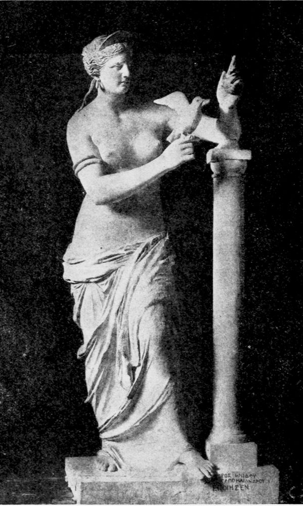 Shall we assume that this head of Tralles is older than the Venus of Milo and that we must look upon the art of Pergamum as the school in which our artist, Agesander or Alexander or whoever he may have been, drew his inspiration? We have no positive proof on either side but internal evidence speaks in favor of regarding the Venus of Milo as original, and we cannot place any confidence in the genuineness of the plinth in the Debay drawing, so may regard the statue as the work of a classical, though unknown, Athenian artist, or at least one who worked for Athens and her temples.{22}
