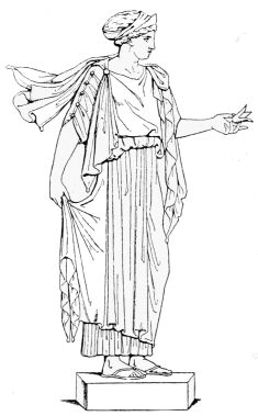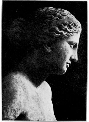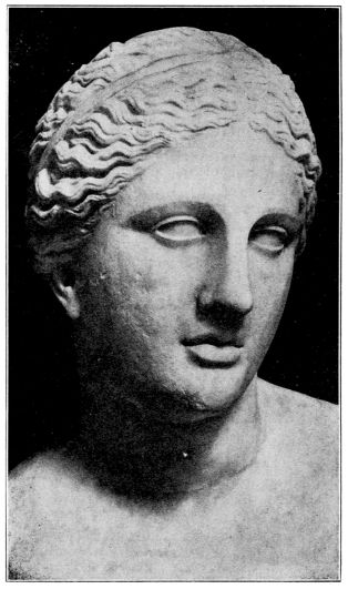 A line in the hair of the statue shows holes which prove plainly that on top of the head there must have been a coronet like that commonly worn by Greek goddesses and called by the Greeks σφενδόνη, “sling,” because with the strings attached it resembles a sling. It was worn especially by the Queen of Heaven, Hera (the Juno of the Roman pantheon).