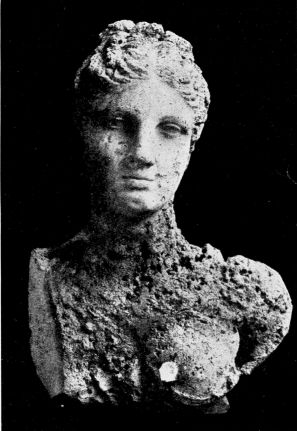 “I measured the two parts of the statue separately and found it very nearly six feet in height; it represented a nude woman whose left hand was raised and held an apple, and the right supported a garment draped in easy folds and falling carelessly from her loins to her feet. Both hands have been mutilated and are actually detached from the body. The hair is coiled in the back and held up by a bandeau. The face is very beautiful and well preserved except that the tip of the nose is injured. The only remaining foot is bare; the ears have been pierced and may have contained pendants.